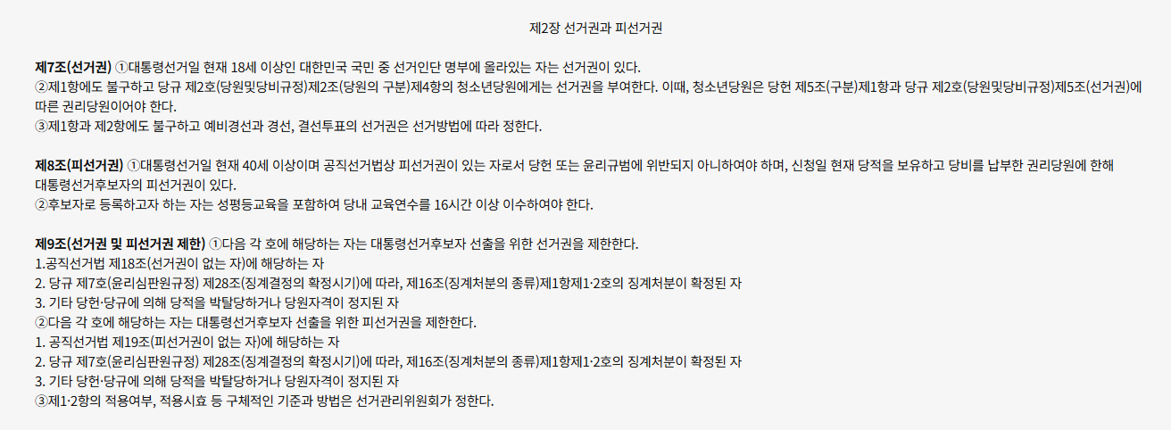 후보자가 되려면 먼저 공식적으로 등록 절차를 밟아야 해요. 등록 기간, 자격 요건, 필요한 서류 등이 이 장에서 정해져 있습니다. 즉, 아무나 나갈 수 있는 게 아니라 당의 기준을 충족해야 합니다.